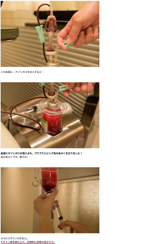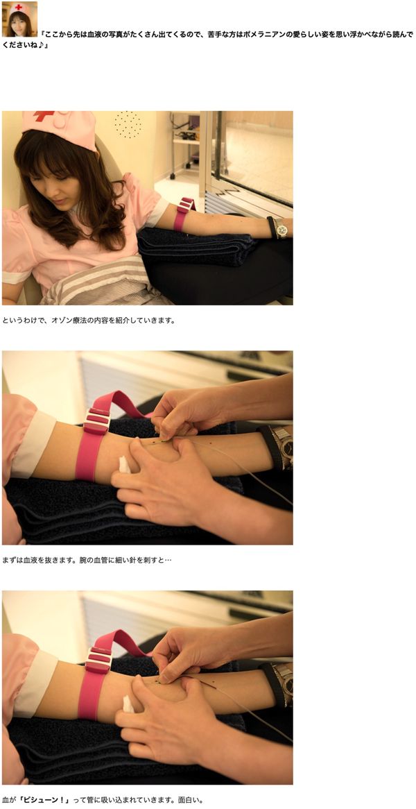 2013年7月のLIGの記事 血液を抜いて戻す?キレナビを使ってオゾン療法を体験してみた。(魚拓) でも自身がナースのコスプレをし、編集者とともに血液クレンジングを実践しています。